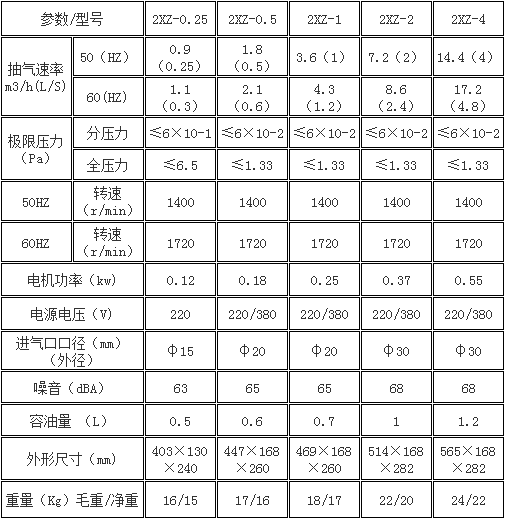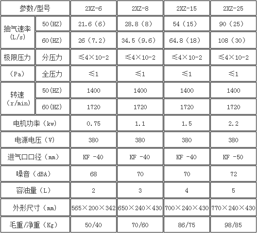 2XZ型旋片式真空泵是用来对密封容器抽除气体的基本设备。它可单独使用,也可用为增压泵、扩散泵、分子泵的前级泵、维持泵、钛泵的预抽泵用;该系列泵具有低嗓声、停泵不返油、启动容易等优点,泵上装有气镇阀,可抽除少量的可凝性蒸汽。本真空泵不能抽除含氧过高的,腐蚀性的,有爆炸性的或有毒的(2XZFL防爆型旋片式真空泵除外),以及含有颖粒尘埃的气体,也不能作压缩泵、输气泵使用。2XZ型旋片式真空泵可用于电真空容器制造、真空焊接、印刷、照相制版、食品包装、真空吸塑、制冷设备维修及仪器、仪表设备配套和实验室等。广泛适用于航空航天、半导体、镀膜、食品包装、干燥、制冷、科研、医疗、电子、化工、医药等专业单位和大专院校等部门的实验室、化验室。